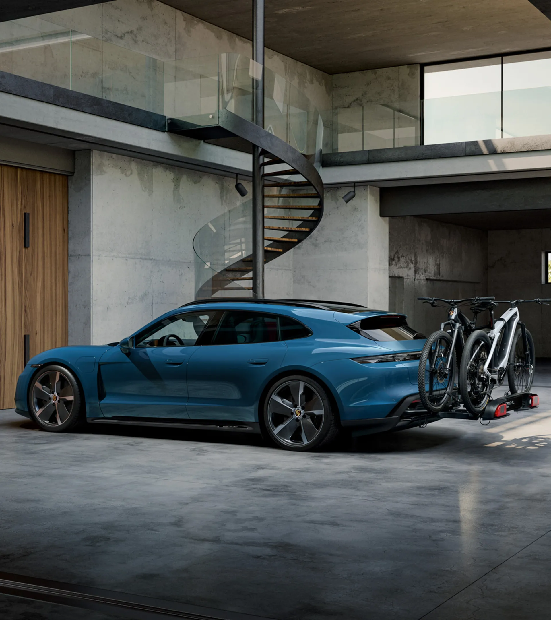 Lockable, foldaway rear bicycle rack for two bicycles or eBikes, for the Taycan Cross Turismo.