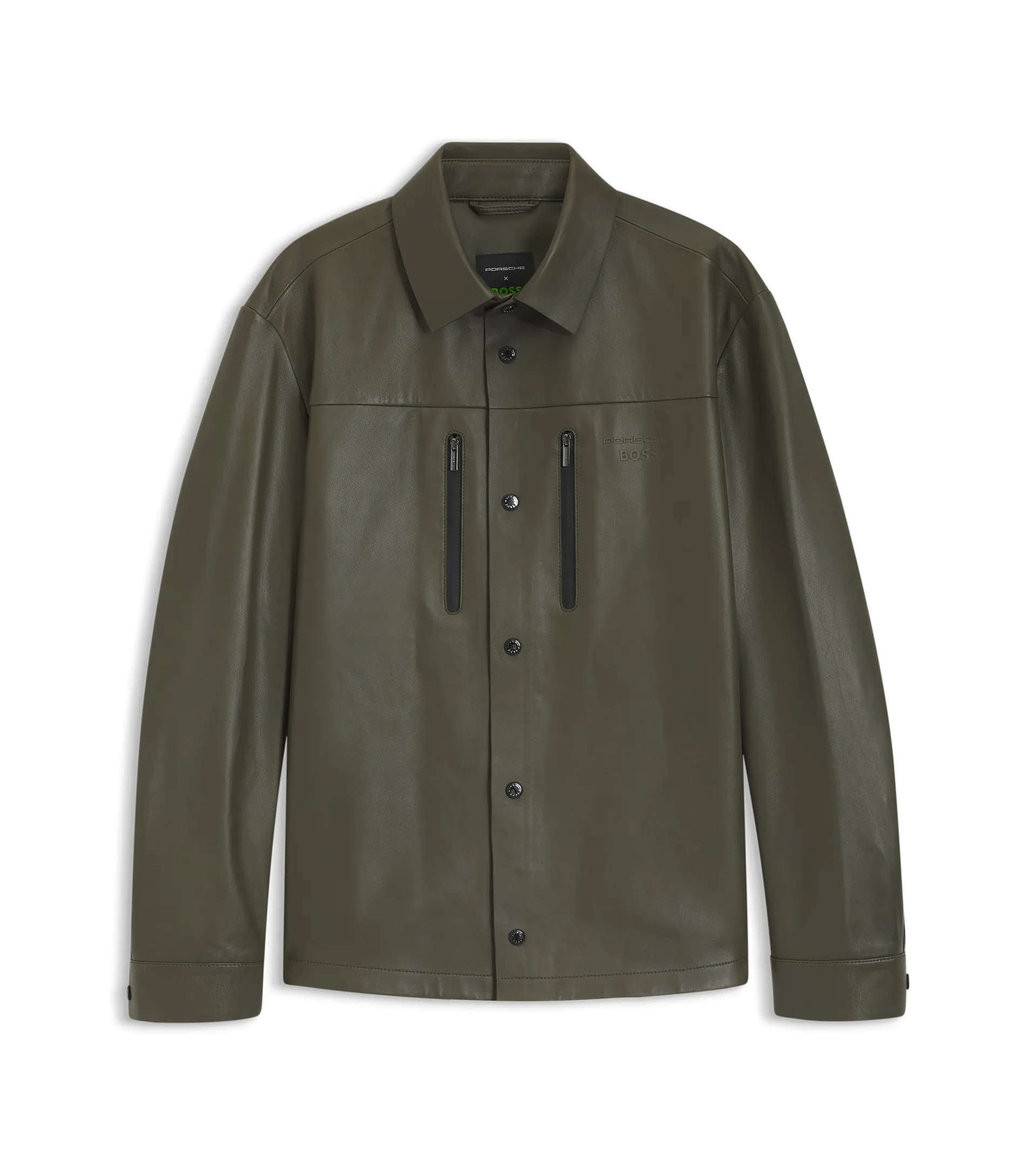 Crafted in soft nappa leather, this regular‑fit men's Porsche x BOSS shirt features embossed branding. Zipped chest pockets. Seam detailing with clean finish. Style meets function in the Porsche x BOSS collaboration: sporty designs with a clean, modern aesthetic.