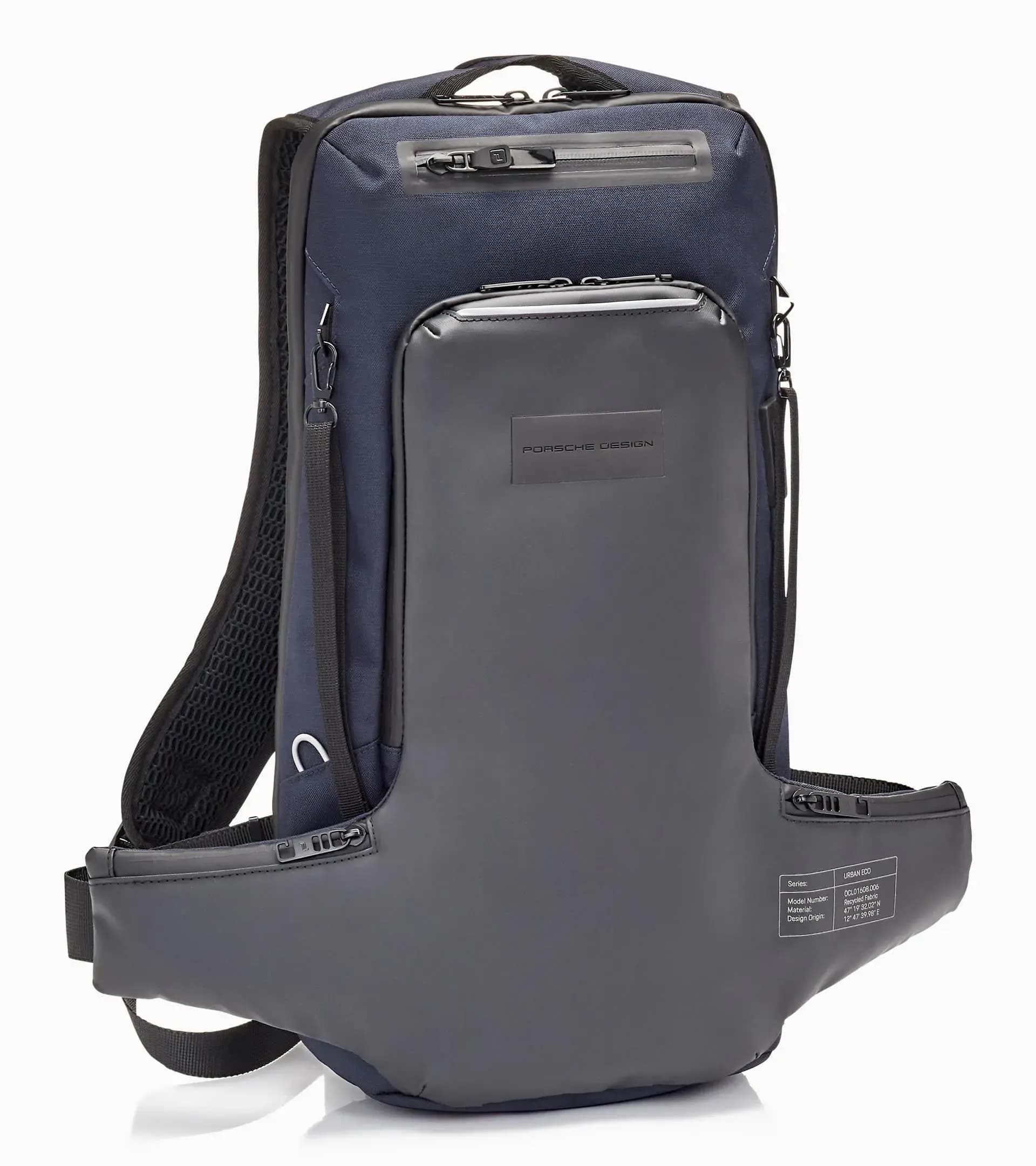 The fusion of smart style and sustainability, functionality and flexibility: The Porsche Design Urban Eco series doesn't stay in the drawer - it’s perfect for modern everyday life. The ergonomically shaped Porsche Design Urban Eco Cycling Backpack is specially designed for those who ride their bike to work. In the slim main compartment with 2-way zipper, there is a padded notebook compartment for laptops up to 13" and padded slide-in compartment for tablets, so you can keep your hardware well-protected, in the attached zipper pocket with business organizer and the further zipper pockets on top and in the waist belt, everything important finds a safe place. Constructed as a dedicated bike rucksack, the backpack offers a perfect fit with side wings that transition into a hip belt with fit-lock, padded, adjustable-length shoulder straps and an additional chest strap. The technical, clean design perfectly complements the functionality. Water-resistant polyester and coated fabric create an exciting contrast, while laminated zippers, black metal hardware and a rubberized logo patch accentuate its sleekness. Exclusive eye-catcher: the print inspired by Porsche model badges with the map coordinates of Zell am See, the home of Studio F.A. Porsche. An outdoor-inspired back panel with trolley link, helmet attachment strap, and rain cover hidden in the bottom add up to sporty comfort.