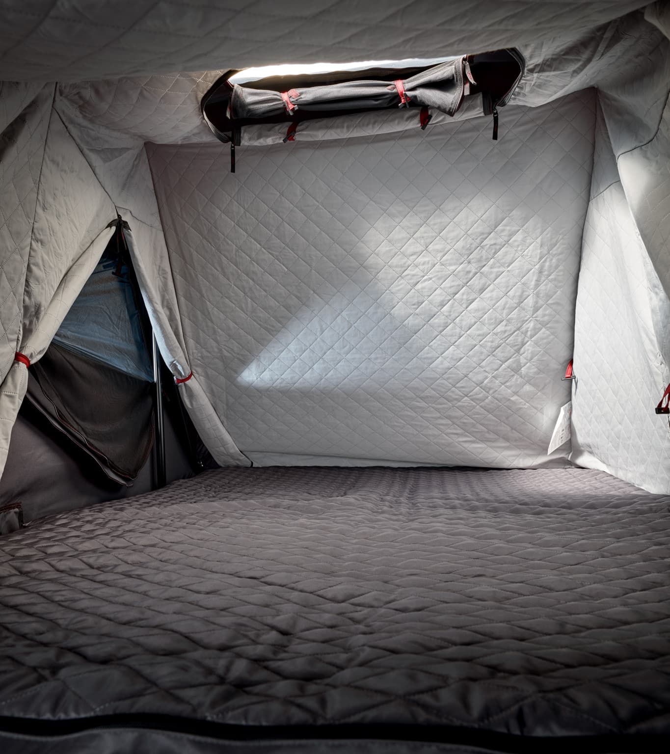 Din Porsche är redo att testa nya gränser. Med innertältet till Porsches taktält är du nu väl rustad för kommande nätter som väntas bli något svalare. Den quiltade dubbelskiktade isoleringen av andningsbart polybomullsmaterial, i kombination med nya högfrekvenssvetsade sömmar, blockerar kalla drag och lagrar kroppsvärme. Och som vanligt genomtänkt av Porsche: den enkla och precisa hanteringen. Innertältet kan fästas på insidan av Porsches taktält på bara några minuter. Alla 3 fönster och huvudingången kan rullas upp för fri sikt över omgivningen.