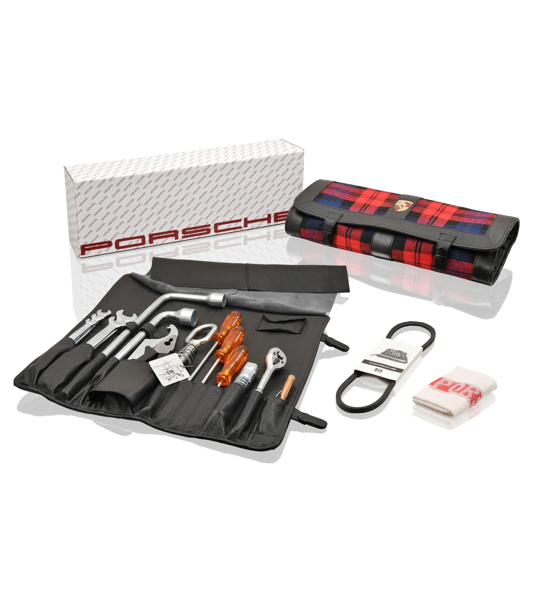 Porsche Classic har gett den nya utgåvan av denna verktygsväska en spektakulär look som påminner om det sena 70-talet. Medan originalet endast hade konstläder är verktygsväskan nu tillverkad av svart äkta läder och rött tartantyg.