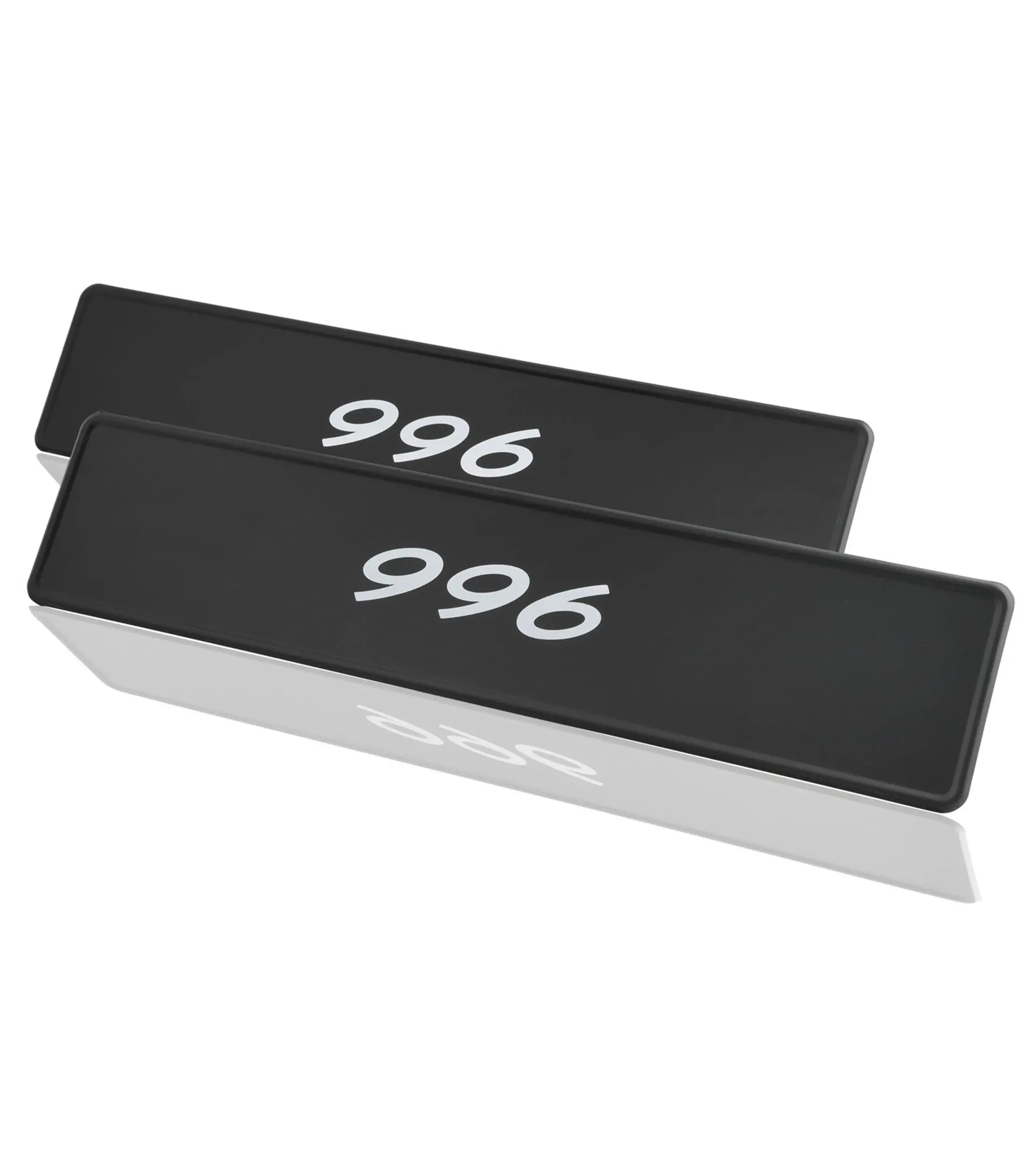 Svart registreringsskylt med vitt ”996”-tryck som mäter 11 x 52 cm. Kan användas för Porsche 996 årsmodell 1998 till 2005. Innehåll: 2 stycken.