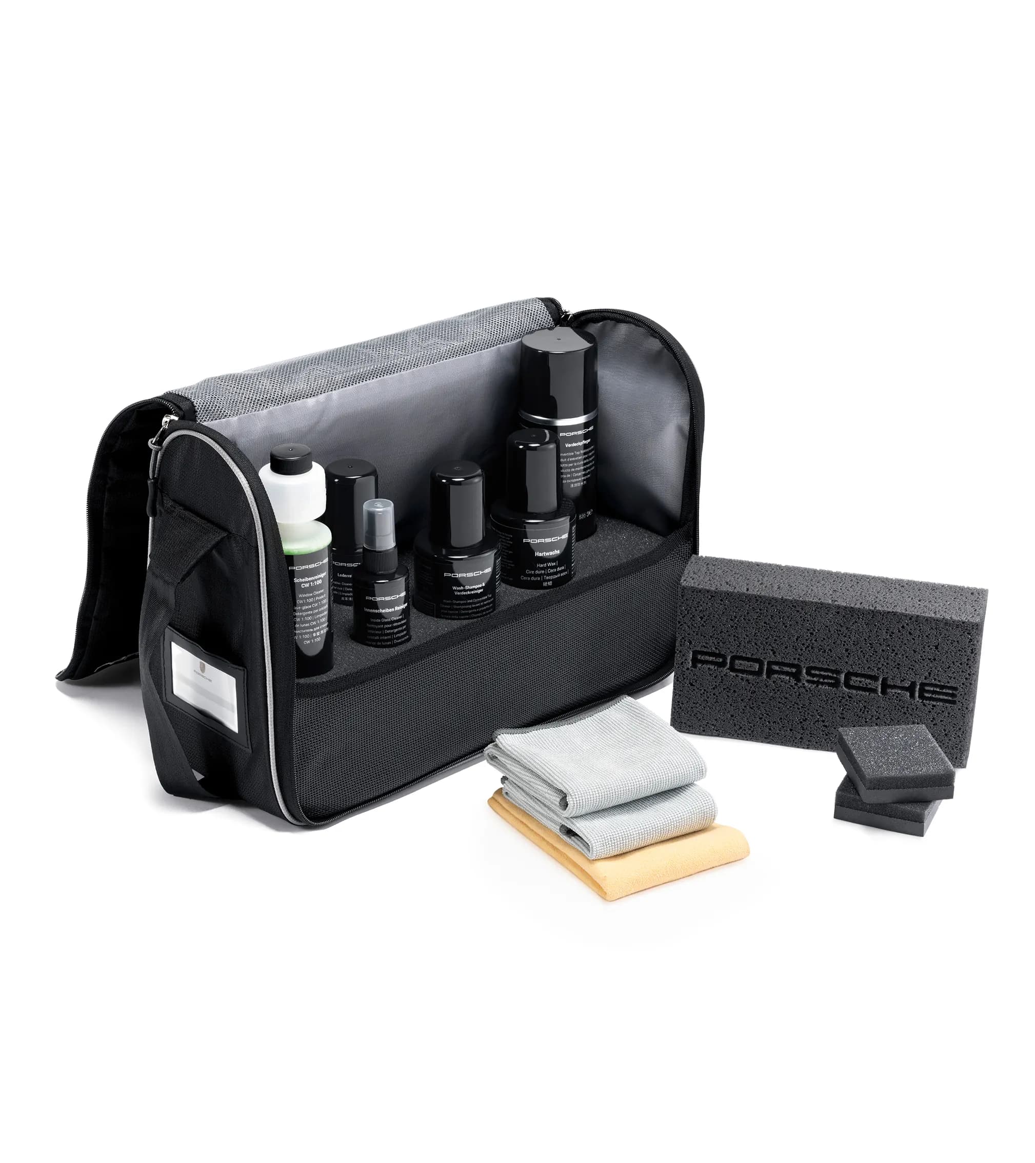 Optimalt anpassad vårdserie i en praktisk bärväska med tillbehör. Innehåller högkvalitativa vårdprodukter som är speciellt godkända för Porsche-bilar för bilens interiör och exteriör. Innehållet omfattar tvättschampo, sufflettrengöringsmedel, hårdvax, sufflettvårdsprodukt, spolarvätska, invändigt fönsterputsmedel, läderrengöringsmedel och lädervård, trasor, svampar och sämskskinn.