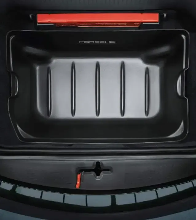 Custom-fit protective liner in Black with „PORSCHE“ logo. Waterproof and washable. Equipped with handles.