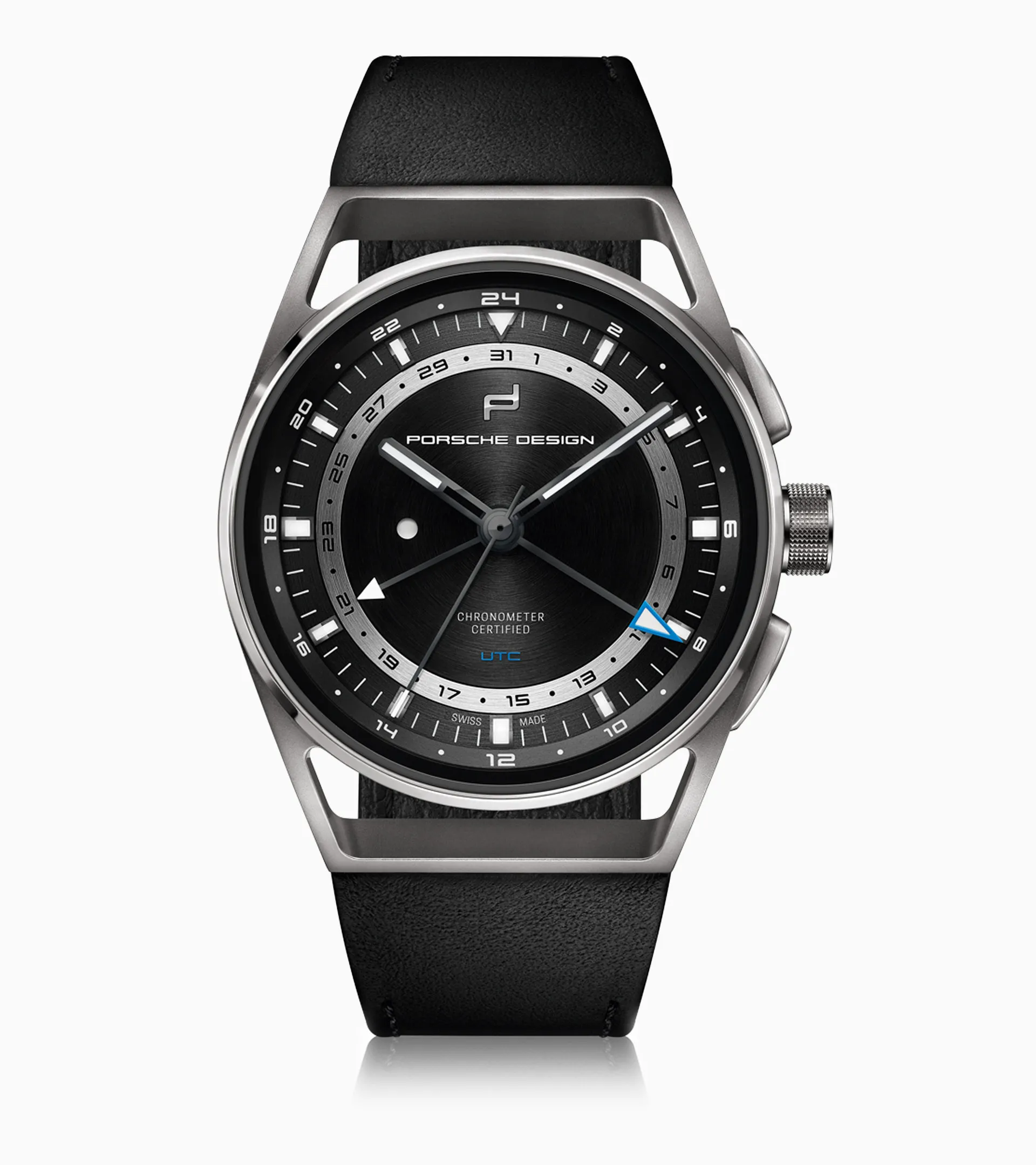 EVERY TIME IN THE WORLD, EXACT TO THE SECOND. In 2019, Porsche Design will make the next statement in the development of travel watches. Once again, the designers' precise analysis of the function leads to the next major development step and to a significant improvement in the operation and readability of travel watches from the past. The element of surprise: an innovative time display switch mechanism.The current time zone can be adjusted in one-hour segments by means of a pusher, without losing the exact time setting [min/sec]. Simple, precise and with automatic adaptation of the date display, the readability of which has also been optimized. Setting the time using the crown is therefore no longer necessary. That makes the 1919 Globetimer UTC the next style-setting design icon from the Porsche Design house which redefines industry standards. Just like the new Werk 04.110 which works inside the innovative timepiece. The caliber was uniquely developed for the special requirements of the Globetimer UTC – and is the second in-house movement in the history of Porsche Design. Of course, precision is the top priority.Therefore, every movement is intensely tested for accuracy by the Contrôle Officiel Suisse des Chronomètres [COSC], a neutral authority in Switzerland. Because when testing the timepieces, the same applies as for Porsche sports cars: standard is not an option. So the requirements are always set higher than necessary. This enables Porsche Design, like Porsche, to always be one step ahead and lead the industry. On the racetrack, just like in the development of exclusive timepieces.