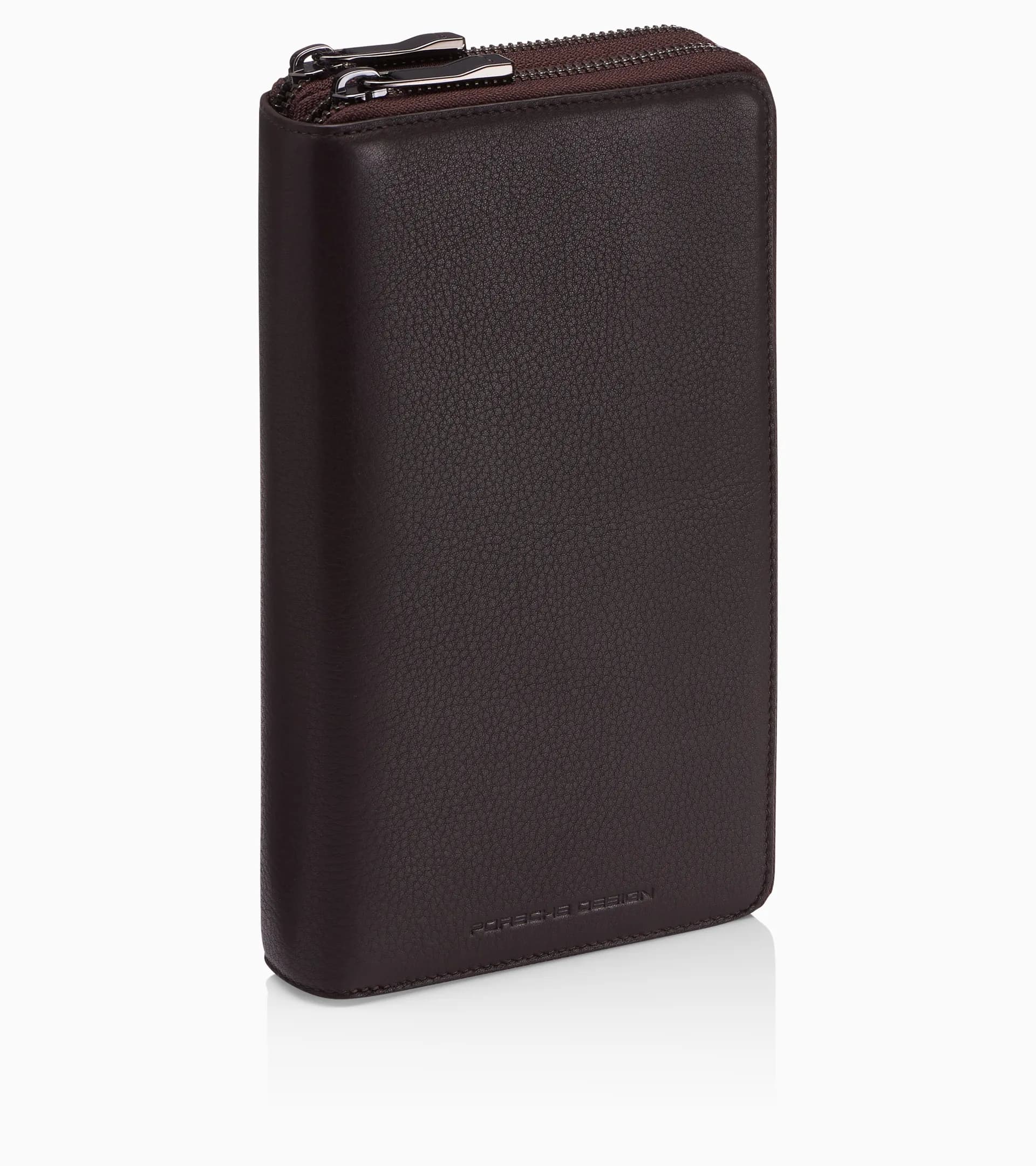 Crafted from high-quality, soft, and natural grained leather, the Porsche Design Business Collection is the epitome of timeless design and durability. Design details like the sewn edges, an embossed Porsche Design logo, and the characteristic V line all subtly convey the exclusivity and craftsmanship injected into the range. The Porsche Design Business Men's Pouch 12 with a wrist loop has an intelligently designed interior, for optimized organization. This is your ideal travel companion. Two sections, each with an all-around zip, provide space for 12 cards in total. There's also a mesh pocket for ID, three larger pockets for bills or small documents, and a zip-pocket for coins. Four spacious pockets provide room for documents, while there's also another mesh slot for your ID, two slots for bills, and two more large pockets—plenty of space for everything you need to travel, including your cellphone.