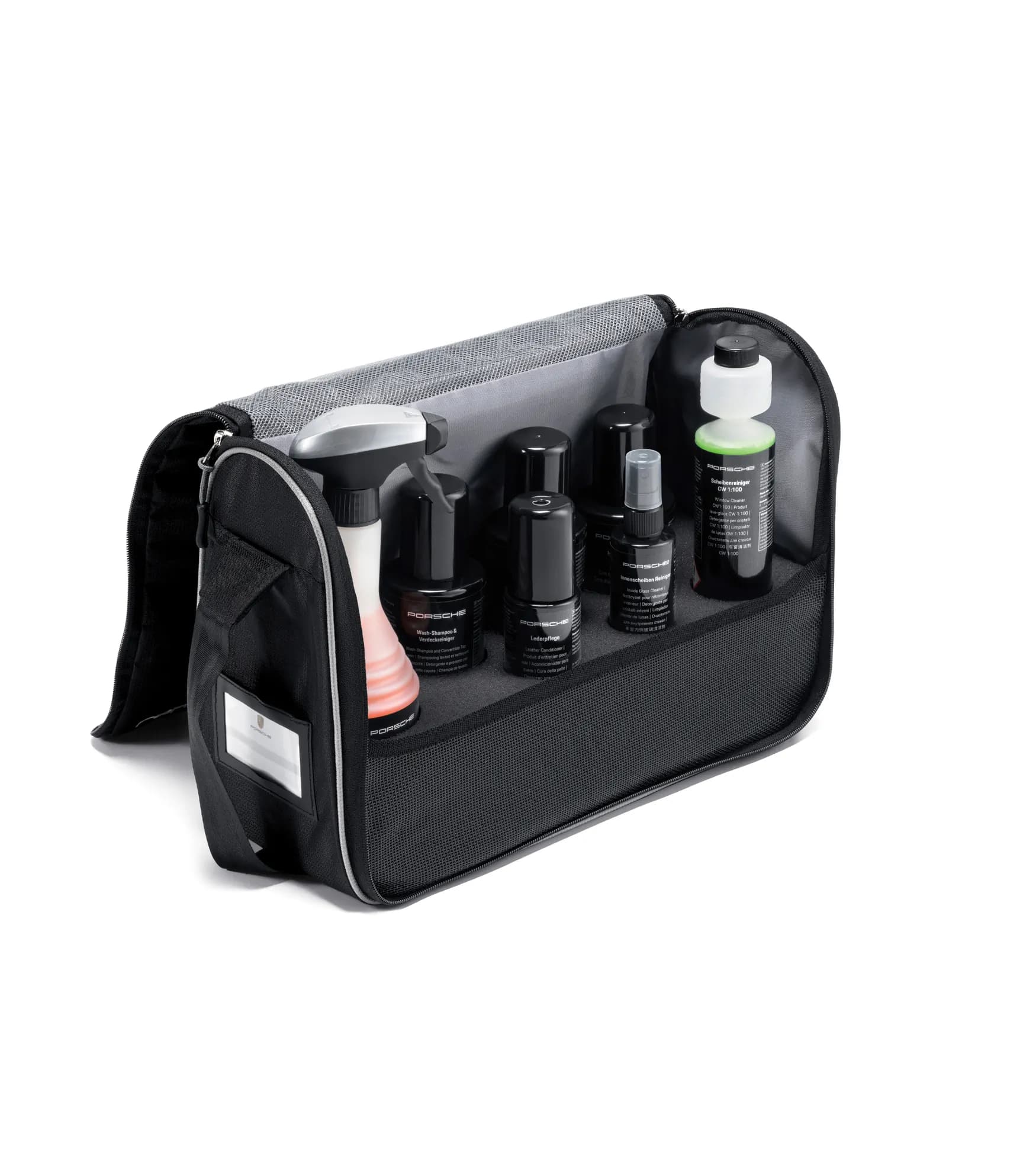 Optimally matched care products in a handy bag with accessories. Contains high-quality care products specially approved for the interior and exterior of Porsche vehicles. The contents comprise insect remover, washing shampoo, paint polish, hard wax, window cleaner, inside glass cleaner, leather conditioner, cloths, sponges and wash leather.