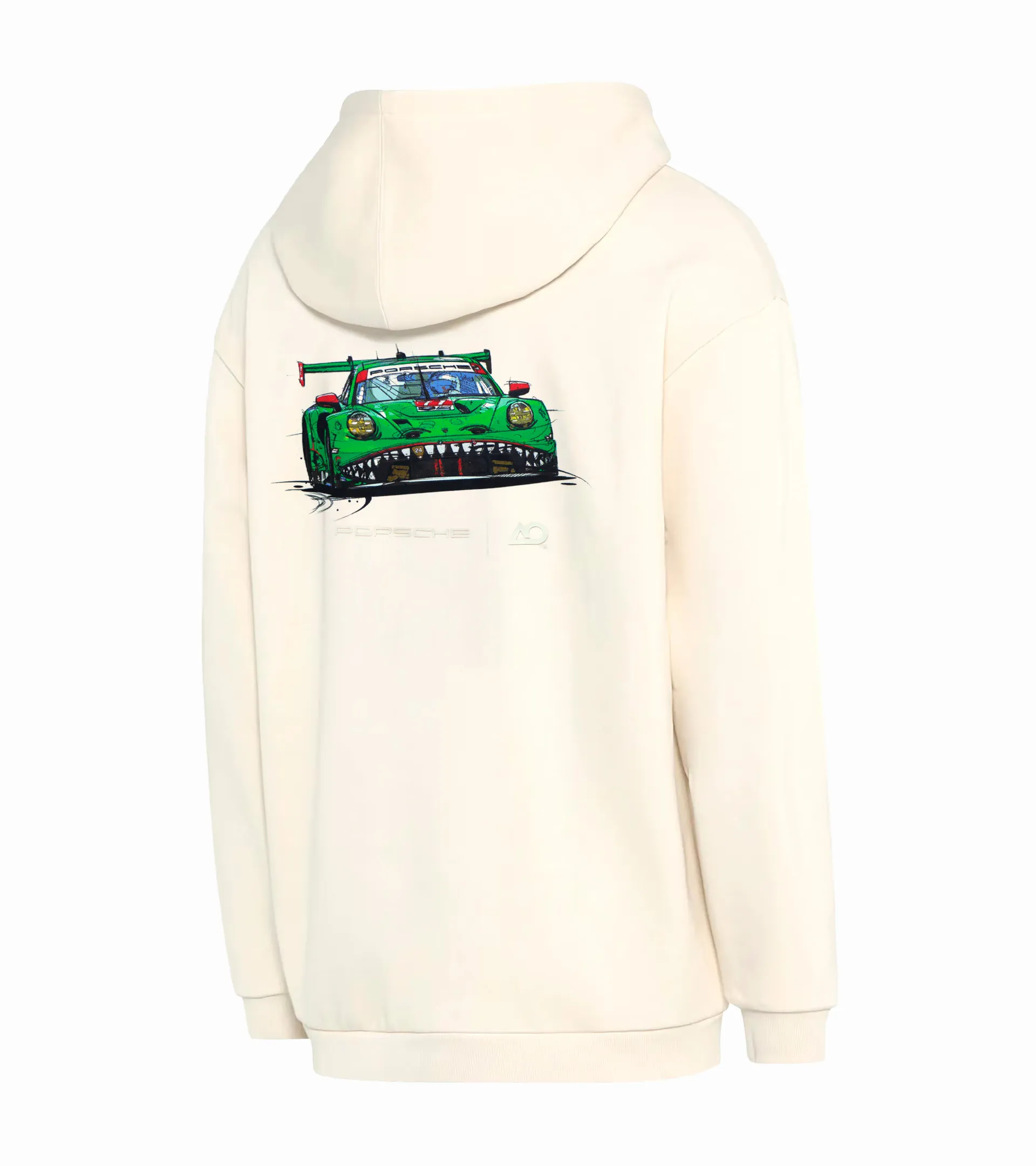 Porsche and AO Racing have teamed up to create a cool capsule collection that celebrates high-performance motorsport and bold fan culture. The inspiration: AO Racing’s IMSA championship winning Porsche 911 GT3 R, dubbed “Rexy” for its green dinosaur-themed livery, one of the most popular cars on the endurance grid. The hoodie features a sketched version of AO's Rexy race car on the back and a playful Rexy dinosaur on the front.