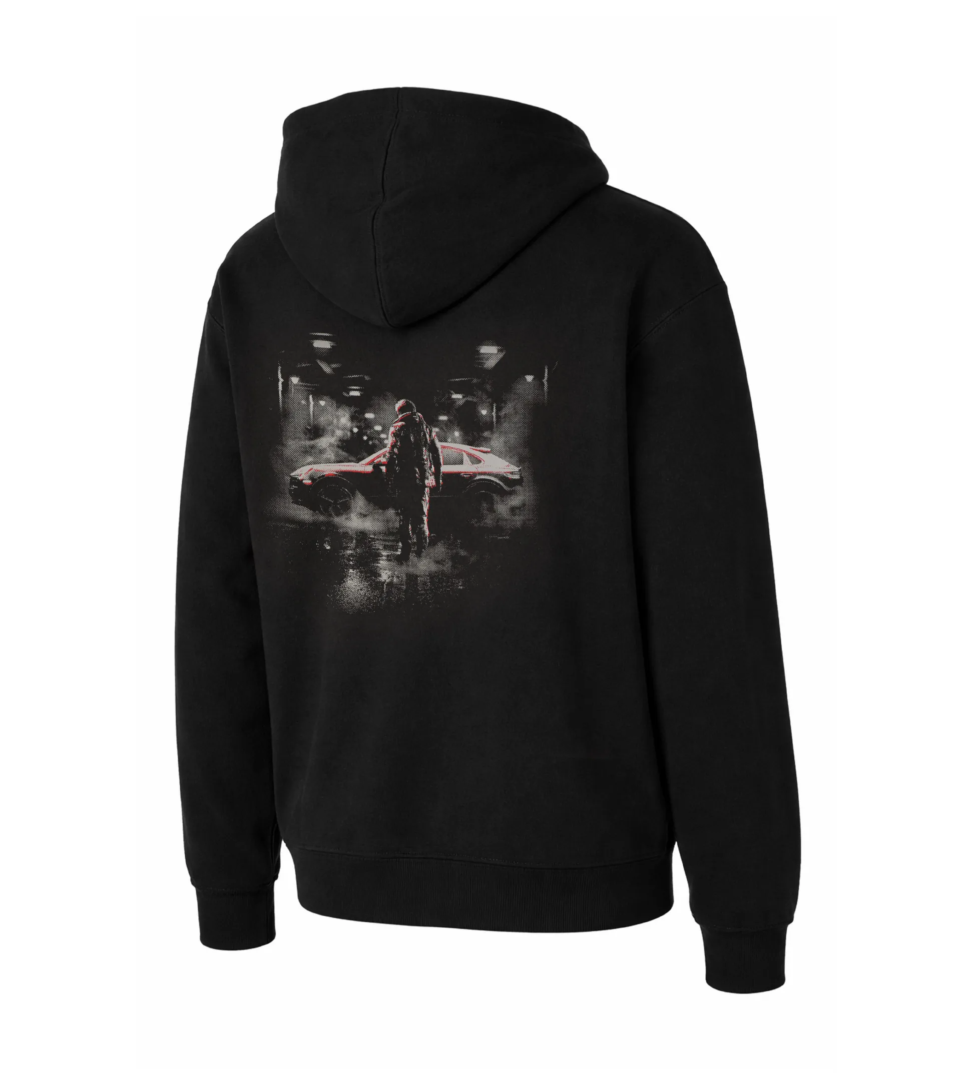 This oversized hoodie features a small Porsche x Resident Evil Requiem logo screenprint on the chest and exclusive artwork across the back.