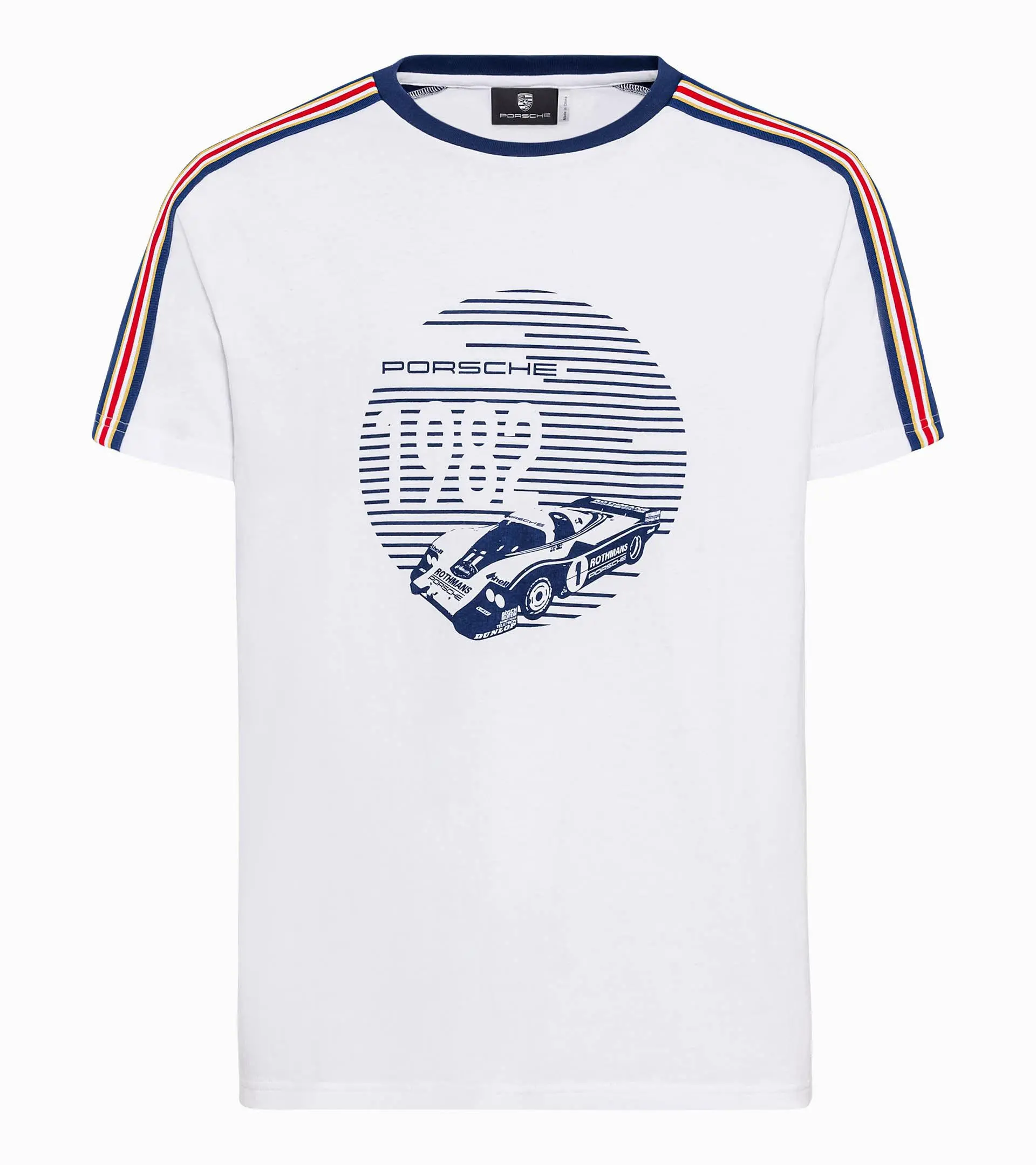 Men's half-sleeve T-shirt with print design and badges inspired by the legendary Porsche 956 in Rothmans livery.