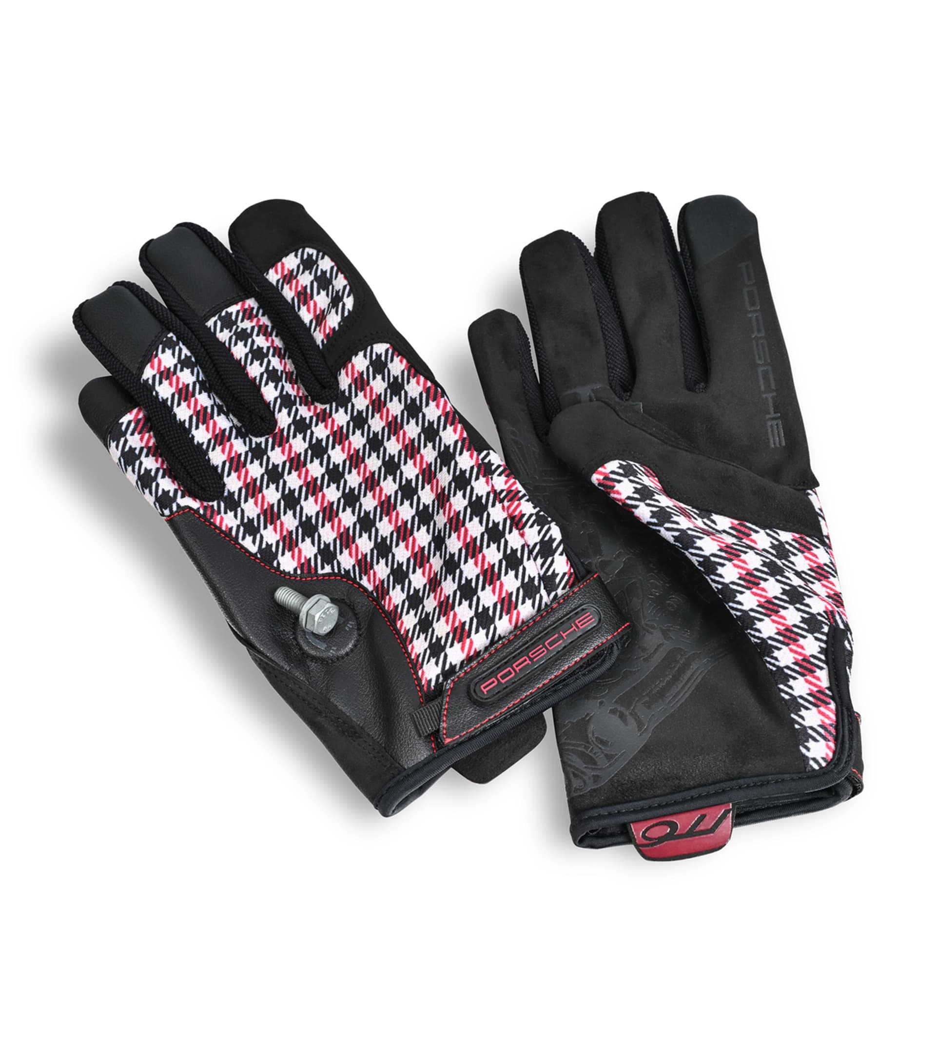 Inspired by the early Porsche 911's Pepita seat pattern, these Porsche Classic assembly gloves in size 10 feature a detailed cutaway of the 901 engine on the palm, enhancing both grip and precision. A built-in magnet on the back of the hand allows you to conveniently hold small fasteners like screws and nuts, and attaches easily to metal surfaces. Certified as personal protective equipment (PPE) against mechanical risks in accordance with DIN EN 388 (2 1 1 1 X), these gloves combine functionality with iconic Porsche styling.