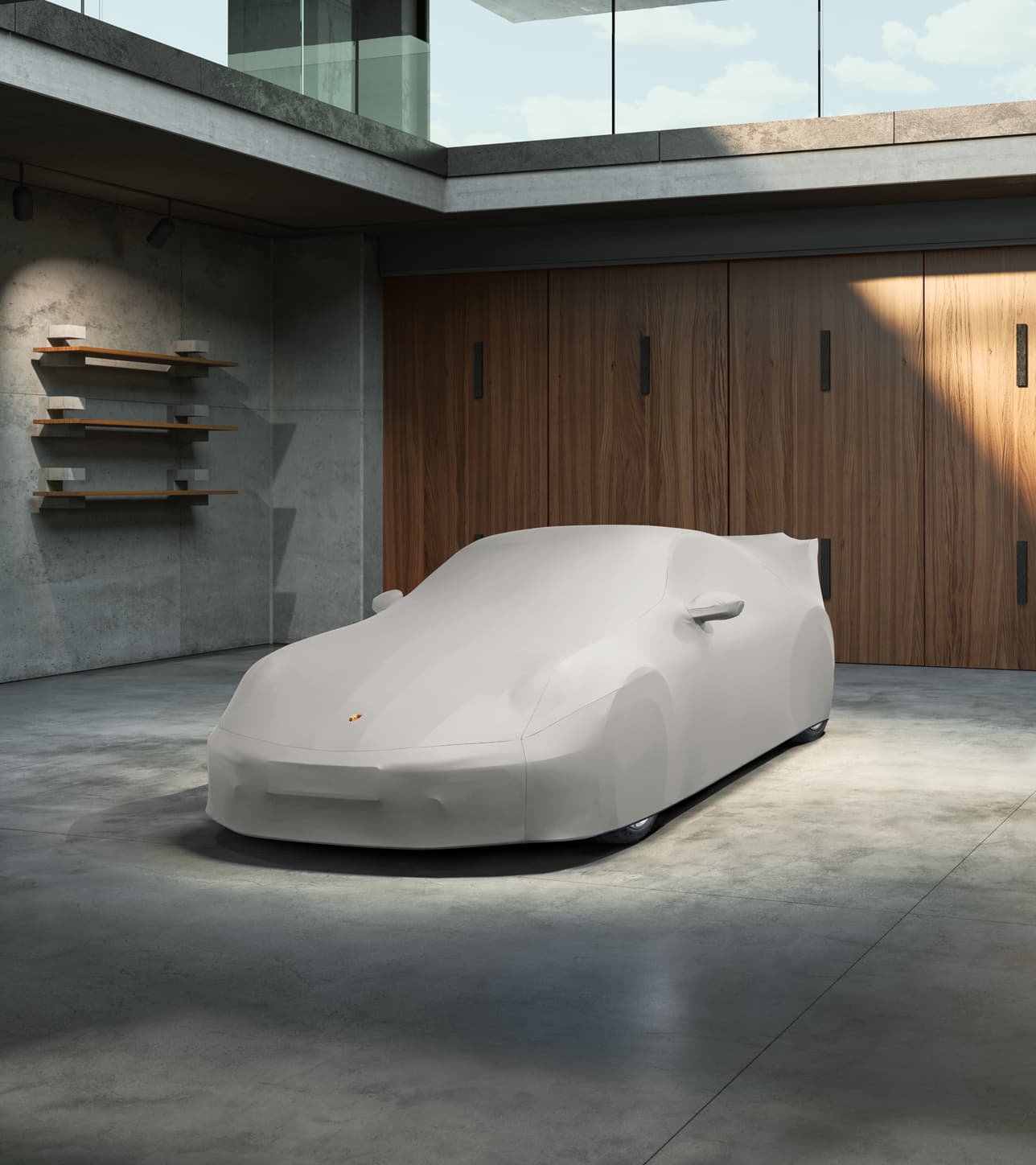 Protect your 911 GT3 (992) with this perfect-fit outdoor car cover featuring a full-color Porsche Crest. Breathable, water-repellent material with a viewing window for the rear license plate and anti-theft protection. Includes handy bag.