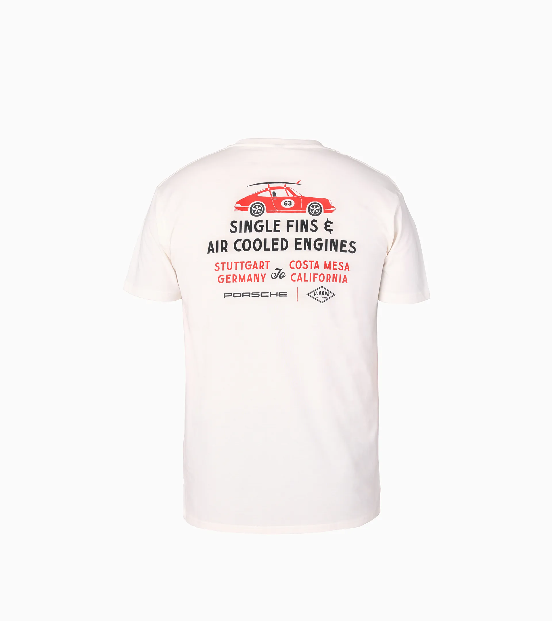 Porsche and Almond Surfboards - a collaboration born in California. This T-shirt with a colorful back print perfectly represents the spirit of this partnership and celebrates the origin of the Porsche 911 in 1963 and laid-back ' 60s surf culture in Southern California.