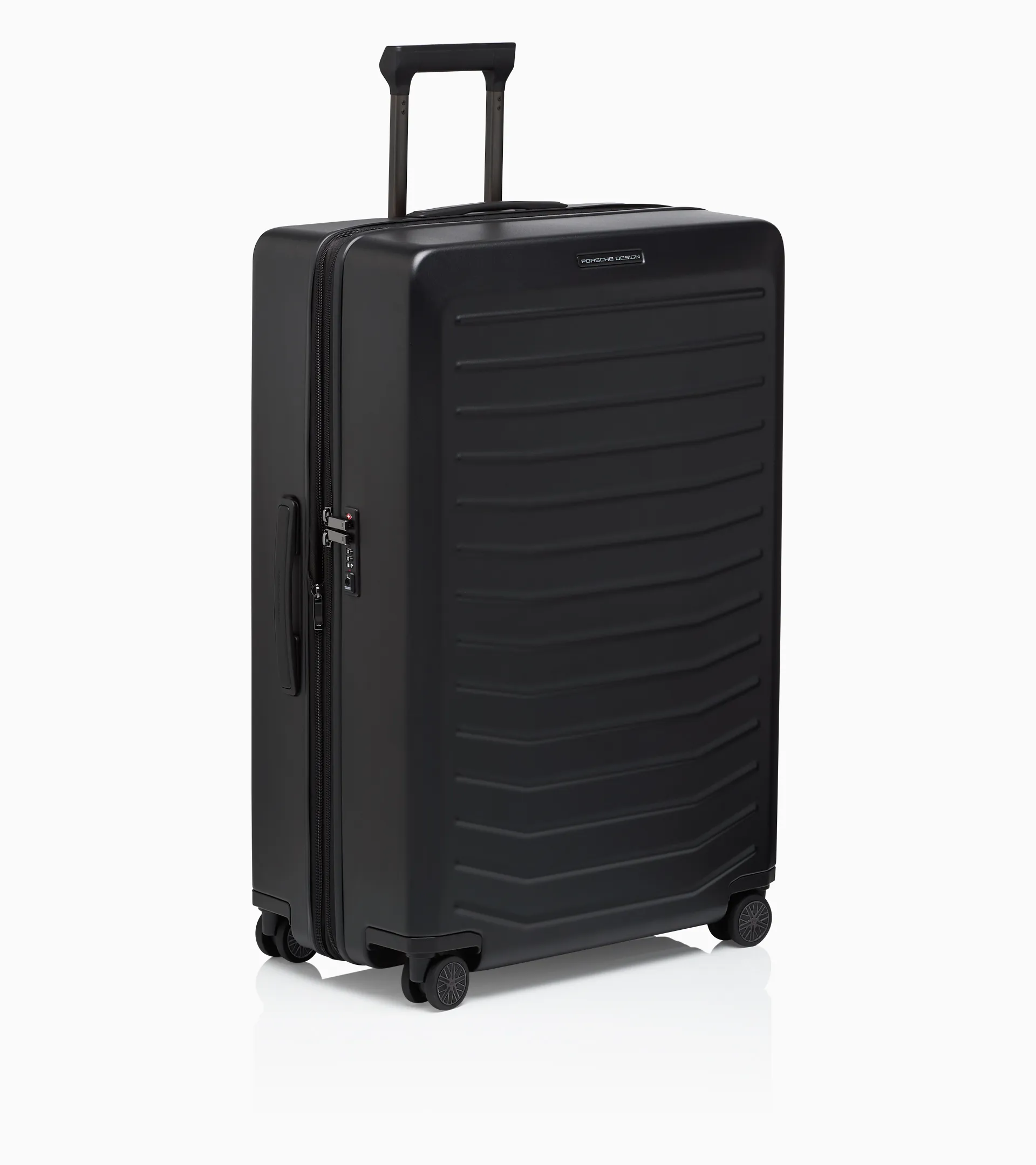 Large 4-wheeled travel case in lightweight plastic. Exclusive design by Studio F. A. Porsche with integrated TSA-approved lock for travel to the USA.