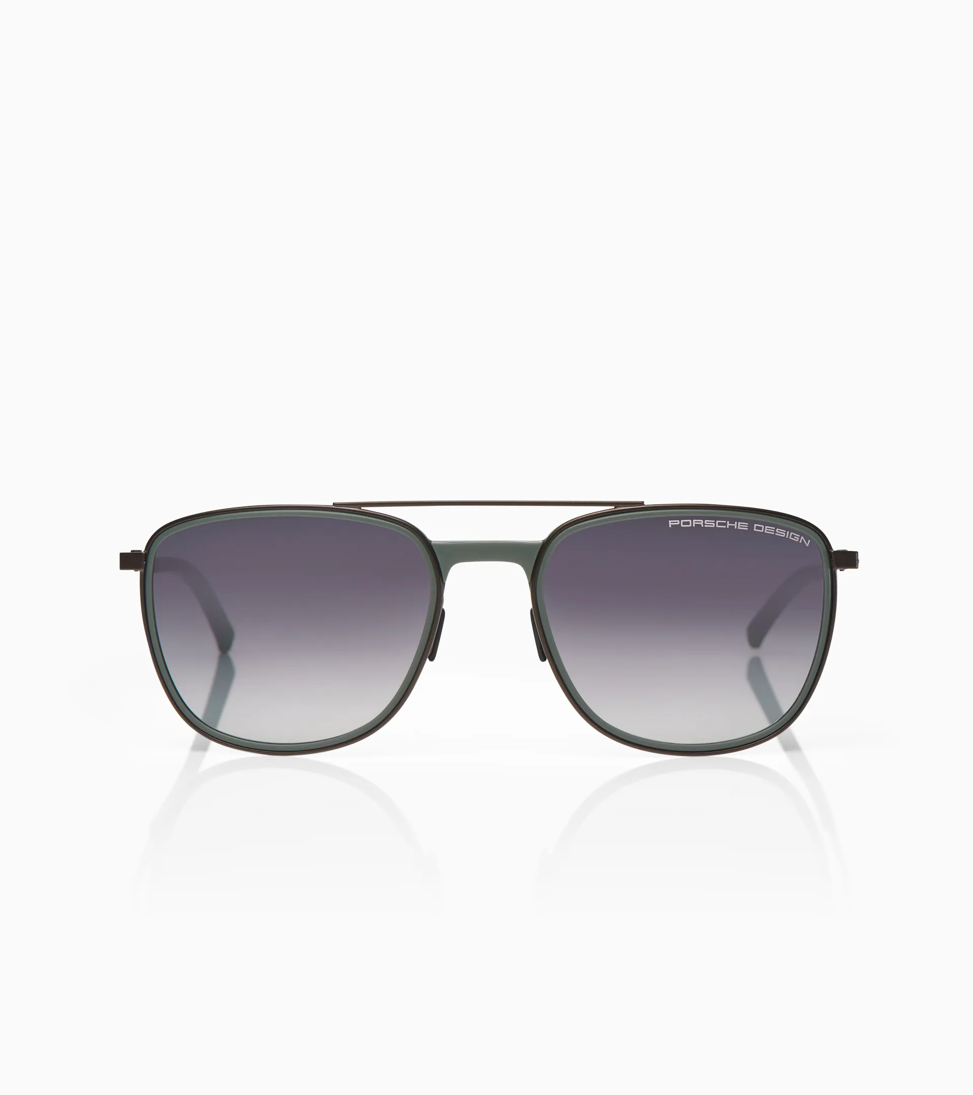 Innovative, angular lines and the bilayer material of these sunglasses – complete with accent colors – culminate in an utterly unique look. The interplay of matte and shiny plus delicate and bold elements intensify the progressive fusion aesthetic. Refinement down to the last detail: the brand logo appears on the wide upper edge of the temples – which collapse into flat lines when viewed from the side. Masterful design thrives on tension, a central conviction held by F. A. Porsche, perfectly embodied in this striking eyewear design.