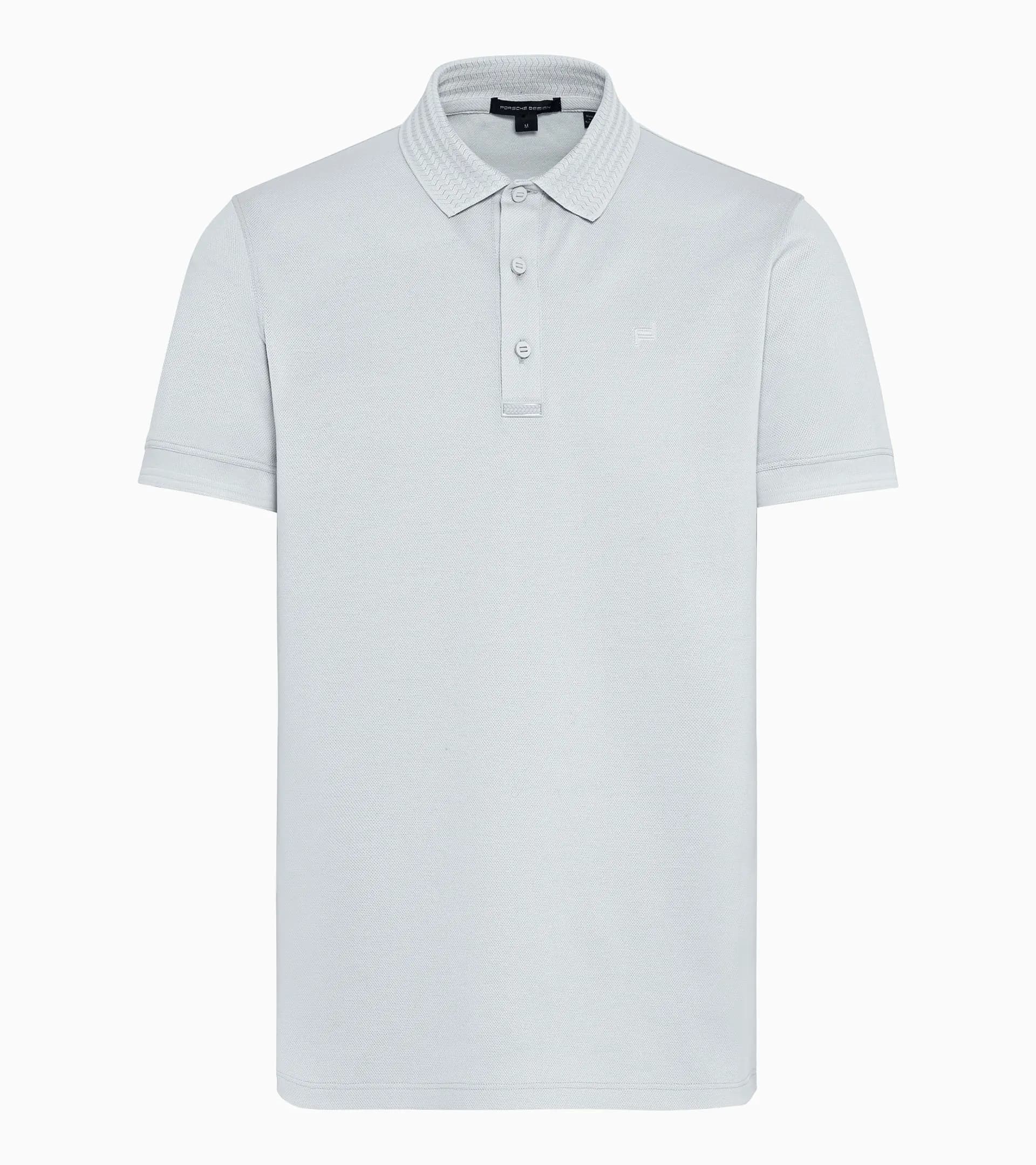 An exclusive basic essential: the polo shirt inspired by the high-tech stainless steel mesh of the legendary Porsche Design Tec Flex pen. With its characteristic structure, the collar attracts everyone's attention and then directs it to the rubberised, polished buttons and the rubberised sunglasses holder at the end of the button placket. Right next to this, the padded, engraved PD icon adds another highlight and emphasises the high quality of the fabric.