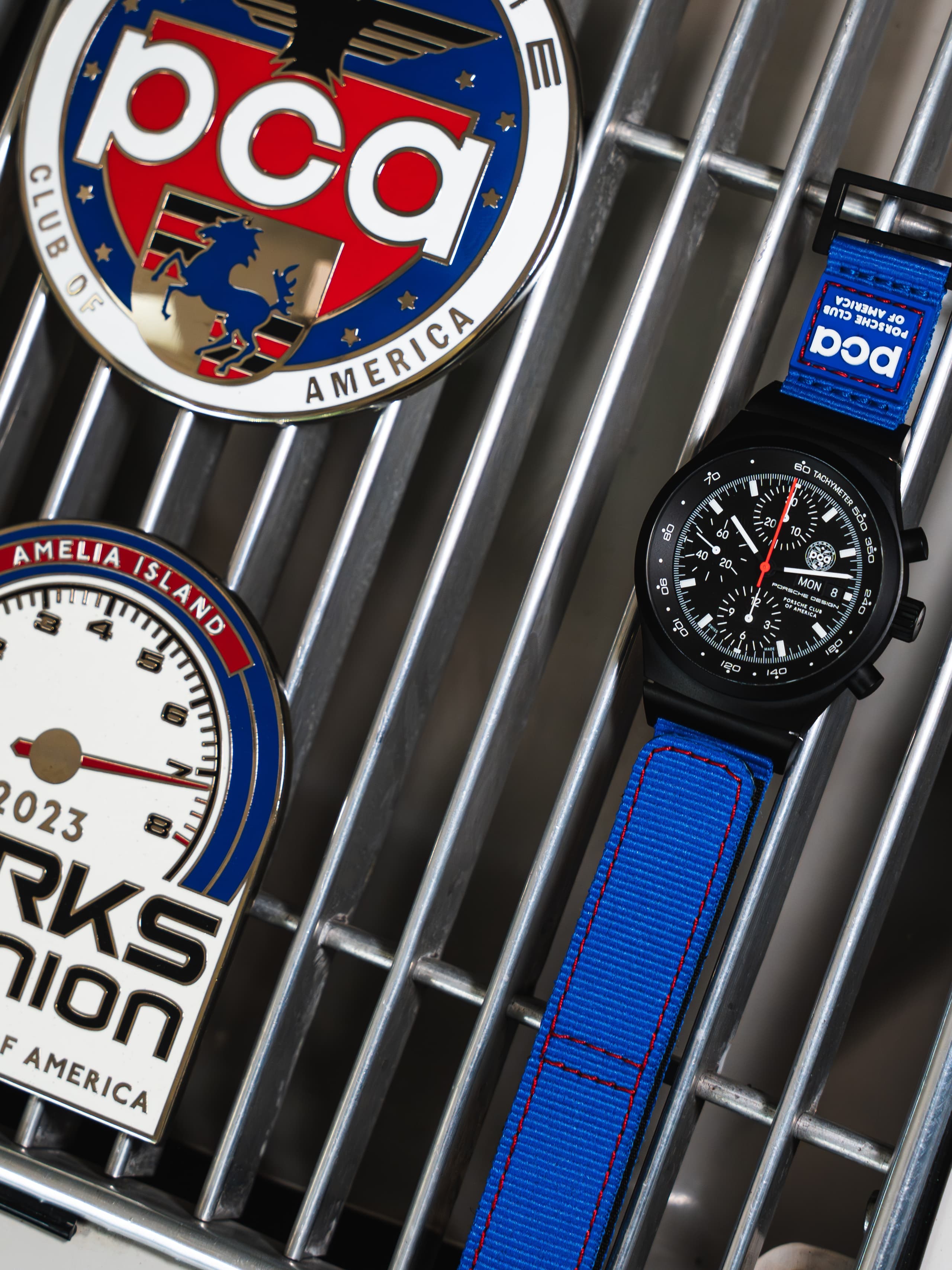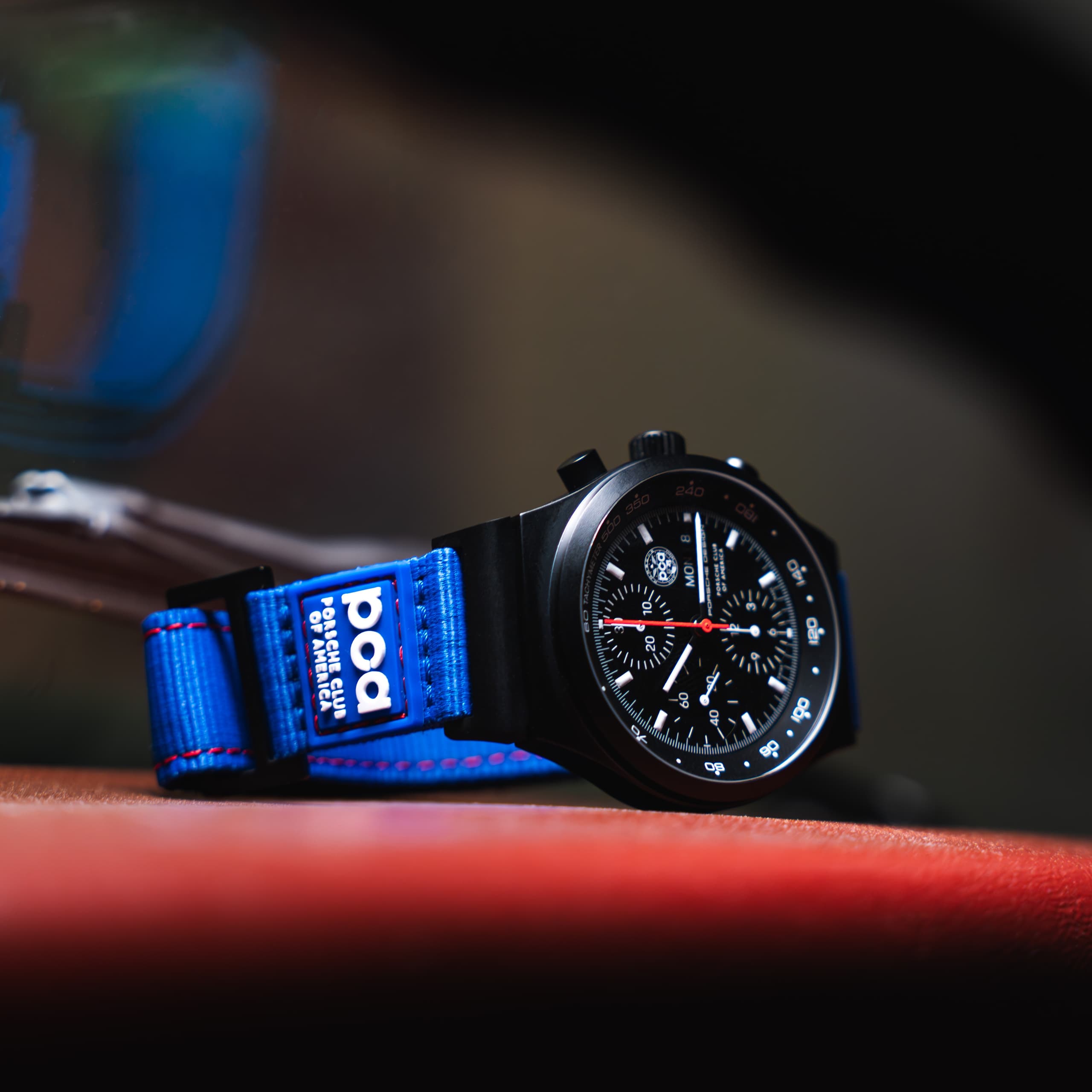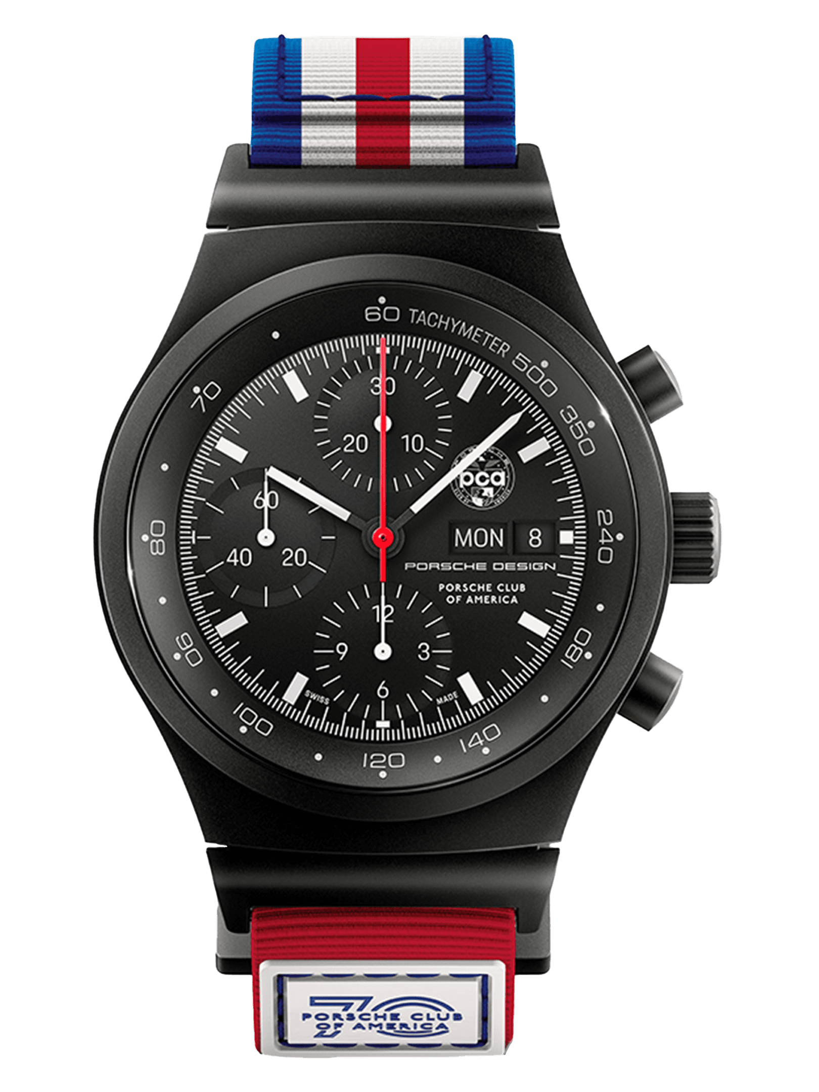 In addition to the regular titanium bracelet, the watch comes with a textile strap in Club Blau featuring the PCA logo. And those, who purchase this extraordinary timepiece by December 31, 2025, will receive a special anniversary gift: the "70-Year Anniversary" strap designed in PCA's red, white and blue colors, and featuring the "70 Years Porsche Club of America" anniversary logo.
