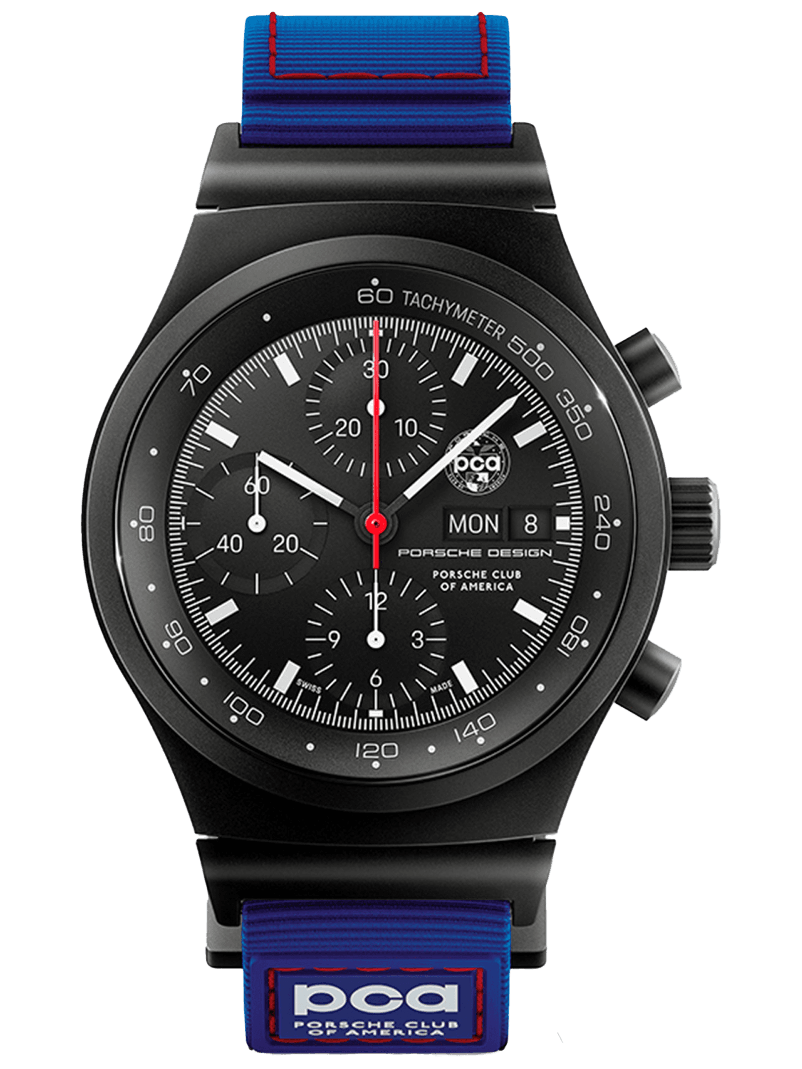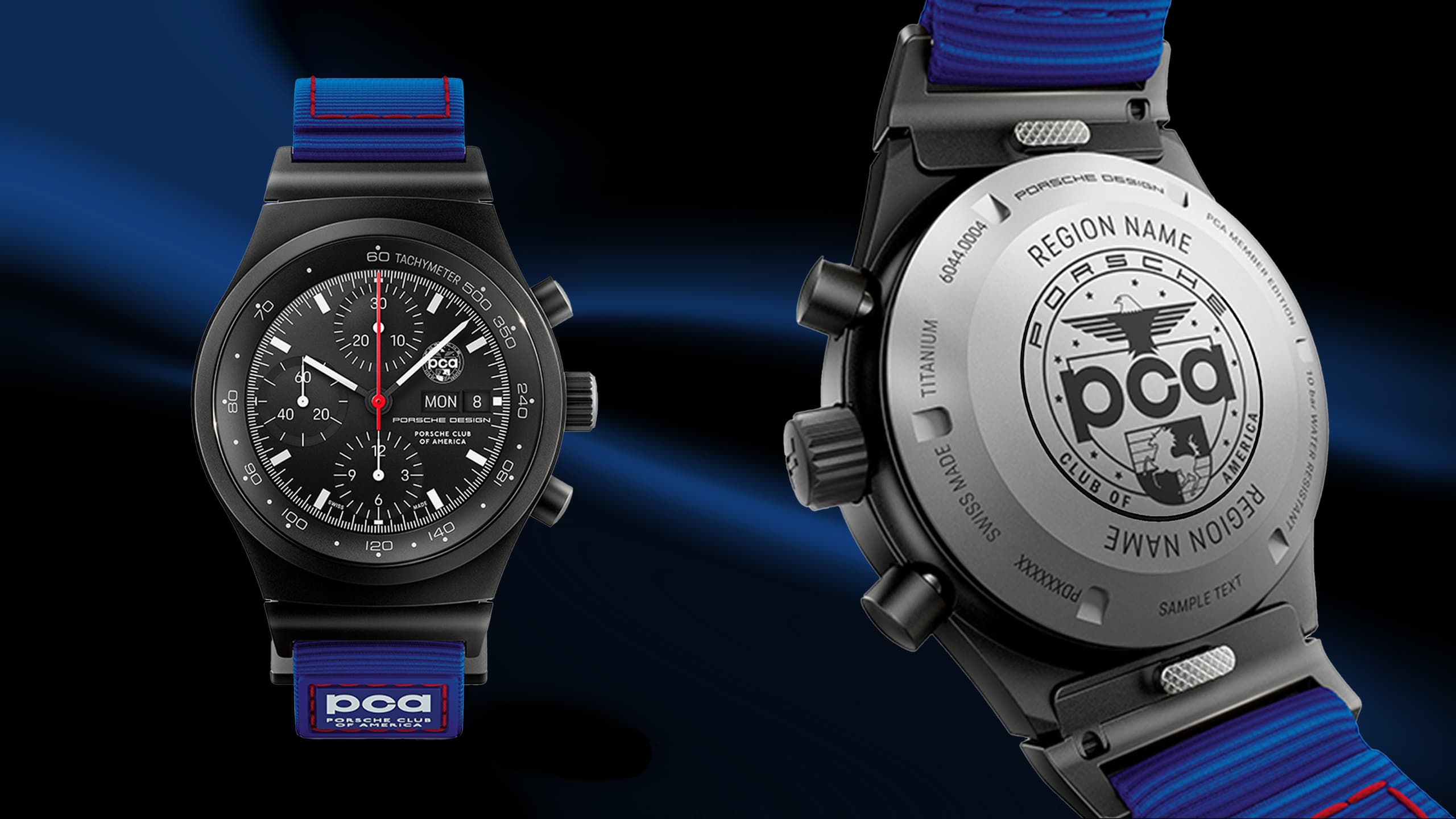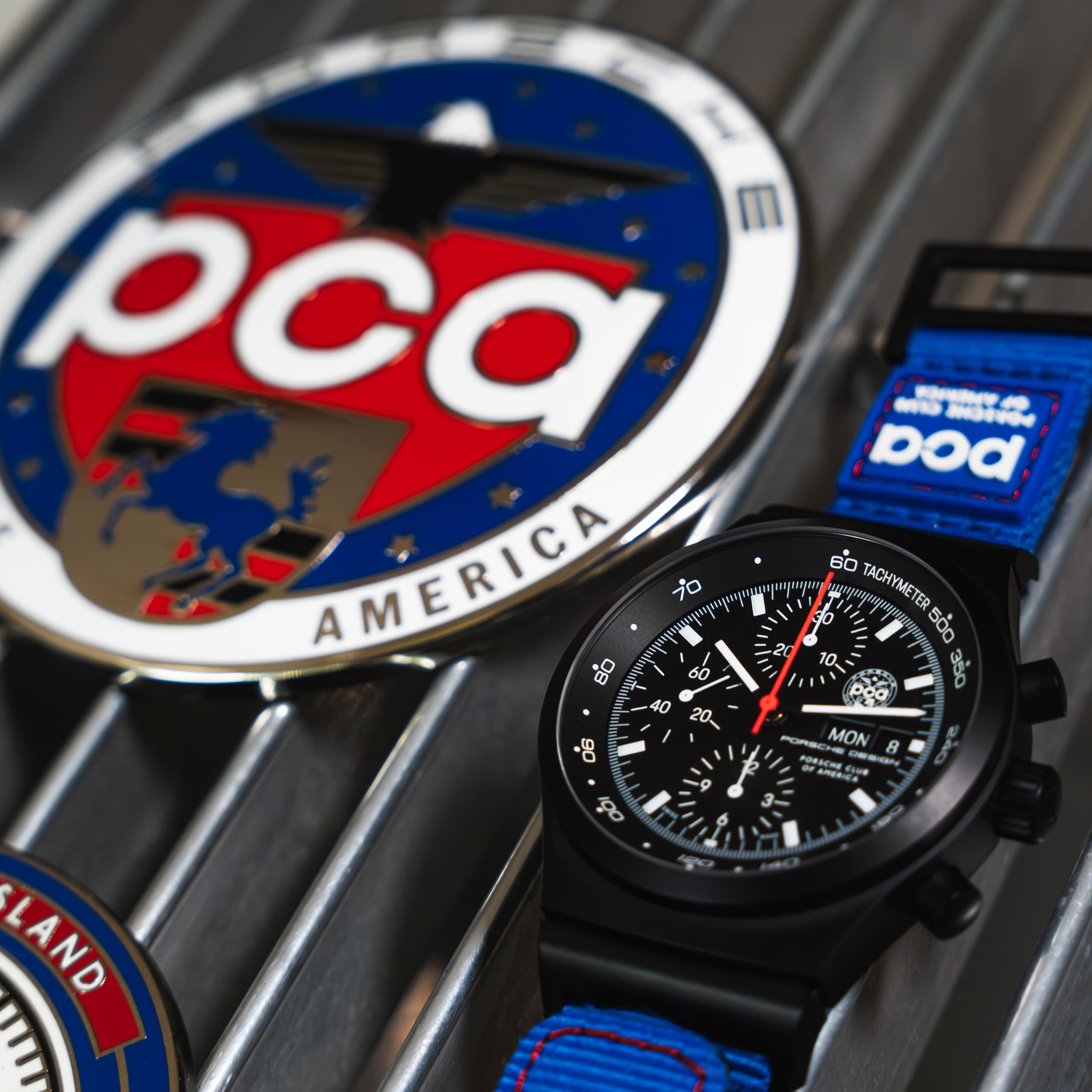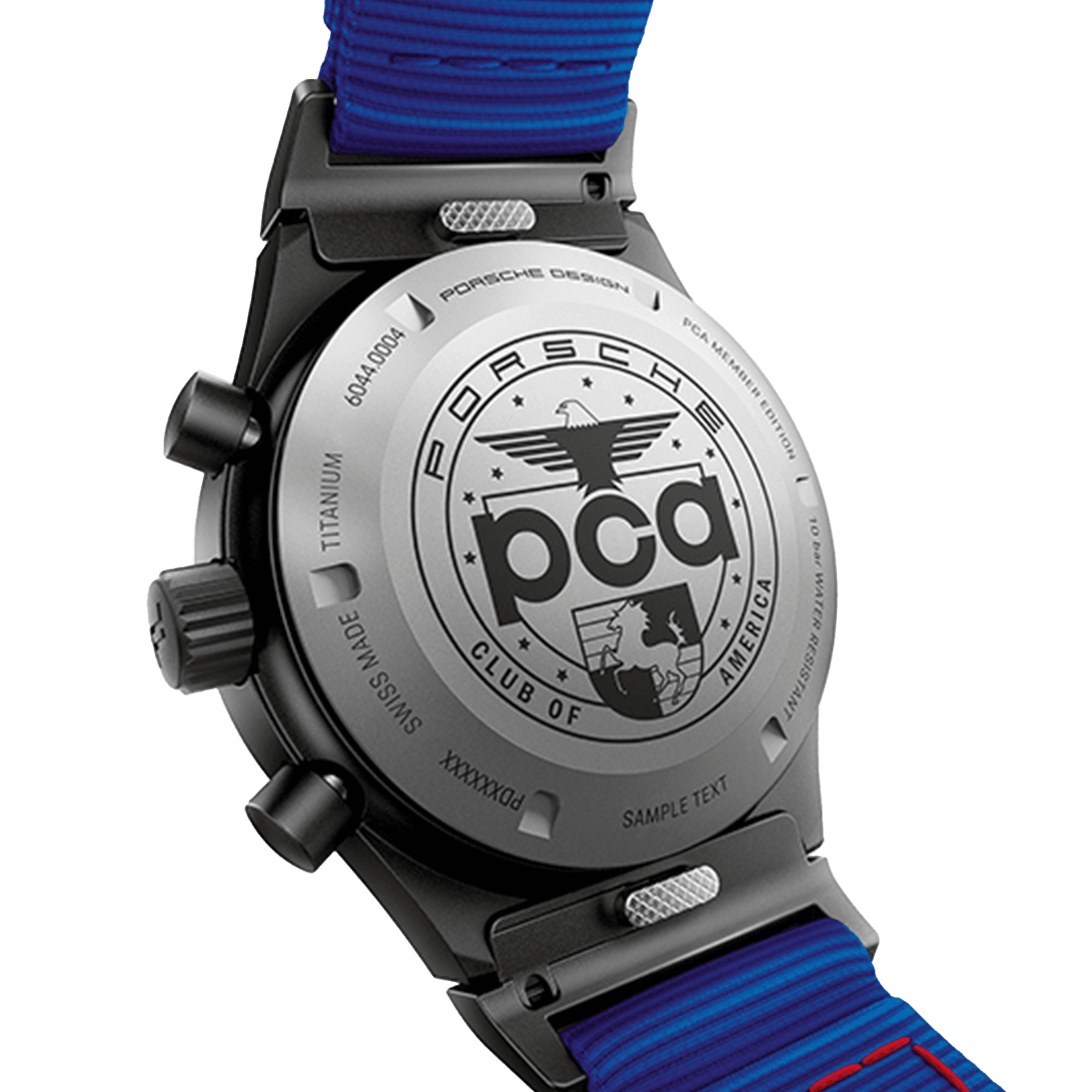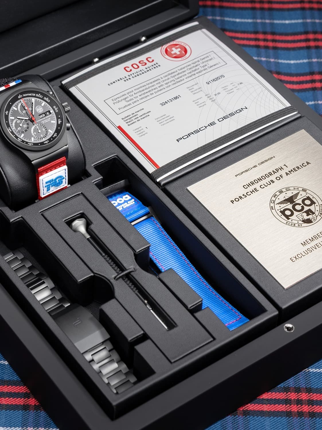 The Chronograph PCA - Member Edition comes in an exclusive Porsche Design timepiece box, featuring a unique engraved plaque engraved with "EXCLUSIVELY MANUFACTURED" or "PCA Region Name".
